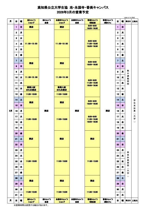 2026年3月営業予定